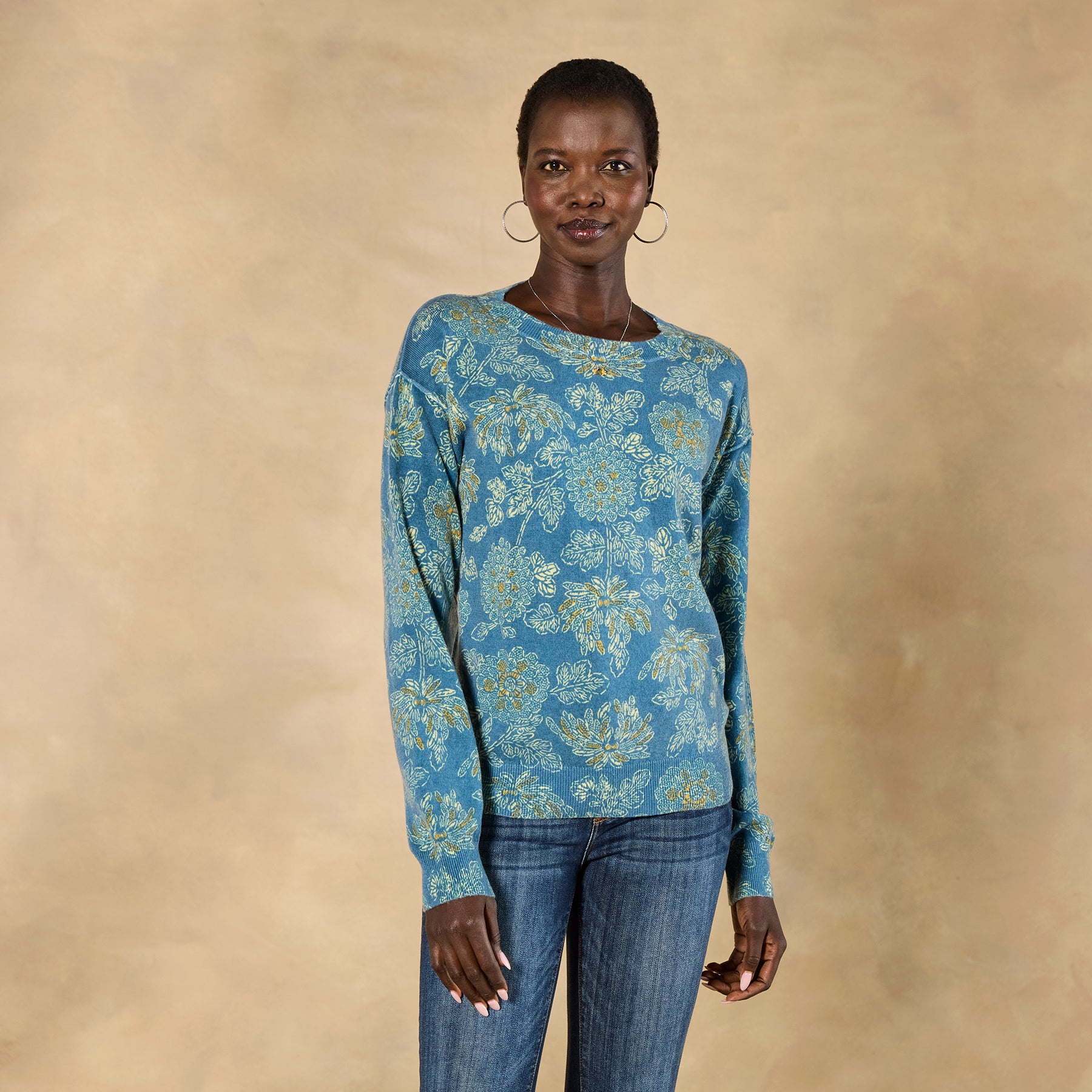 As soft and cozy as can be. our floral printed sweater is one you’ll reach for time and again. Rib trim. Acrylic/nylon/wool. Hand wash. Imported. Exclusive. Sizes XS (0–2). S (4–6). M (8–10). L (12–14). XL (16–18). XXL (20–22). Approx. 22l.