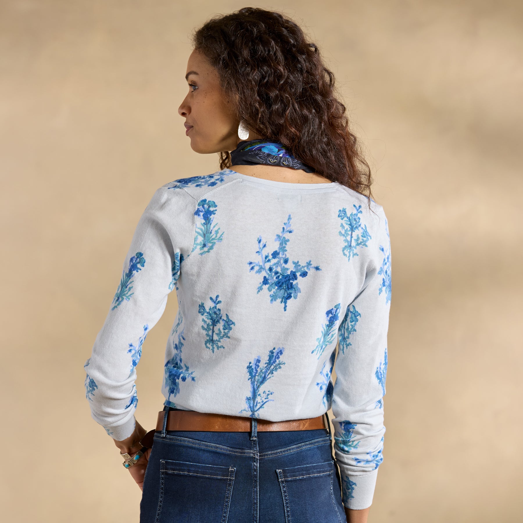 A woven garden party. the Larkspur Cardigan features a flattering fitted shape in a featherweight knit festooned with a feminine floral print. Cotton/linen. Hand Wash. Imported. Exclusive. Sizes XXS (00). XS (0–2). S (4–6). M (8–10). L (12–14). XL (16–18). Approx. 20l.