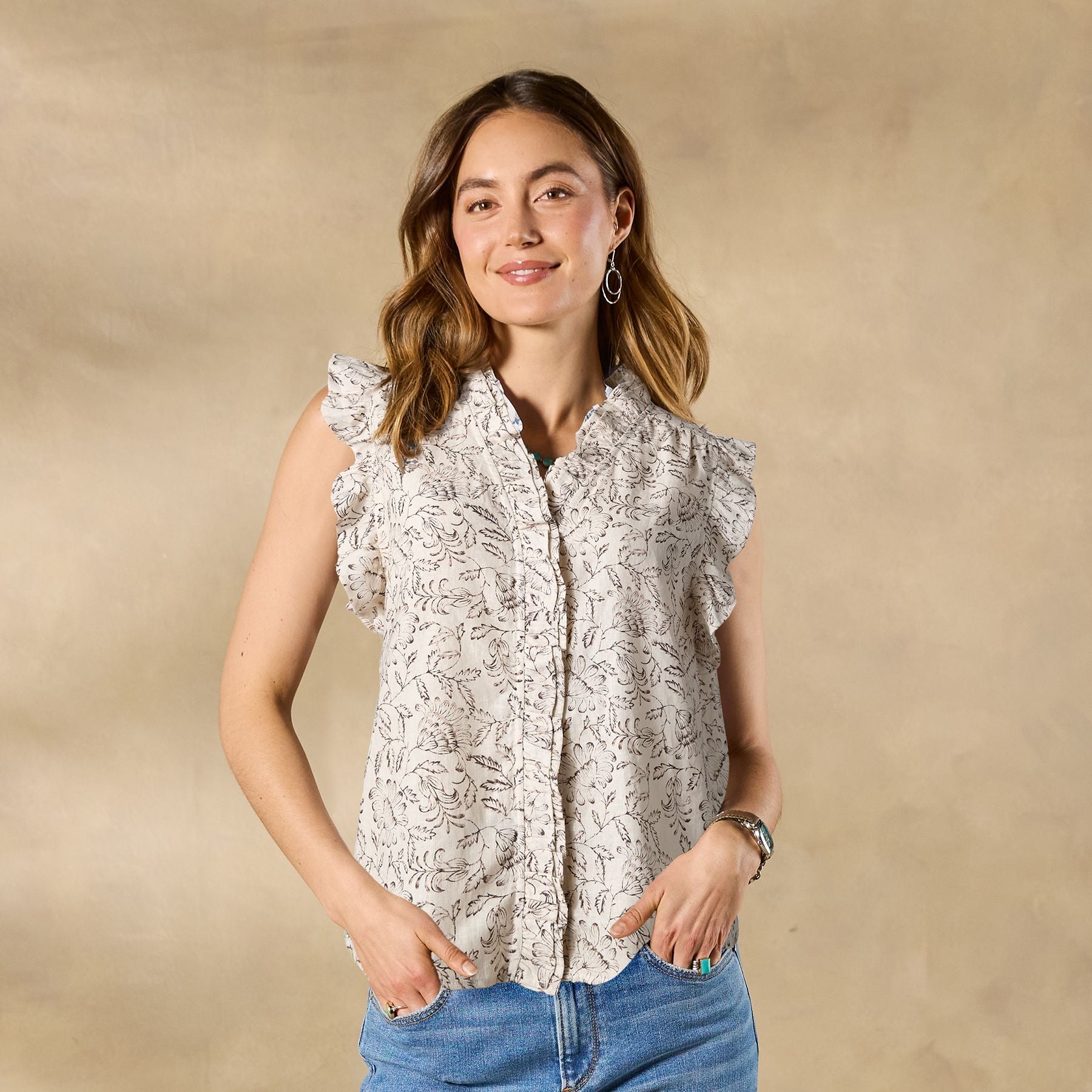 A Sundance fan fave. now in a subtle neutral floral print! Ruffle details at sleeve and bodice; hidden-button placket. Cotton. Machine wash. Imported. Sizes XS (0–2). S (4–6). M (8–10). L (12–14). XL (16–18). XXL (20–22). Approx. 24.75l.
