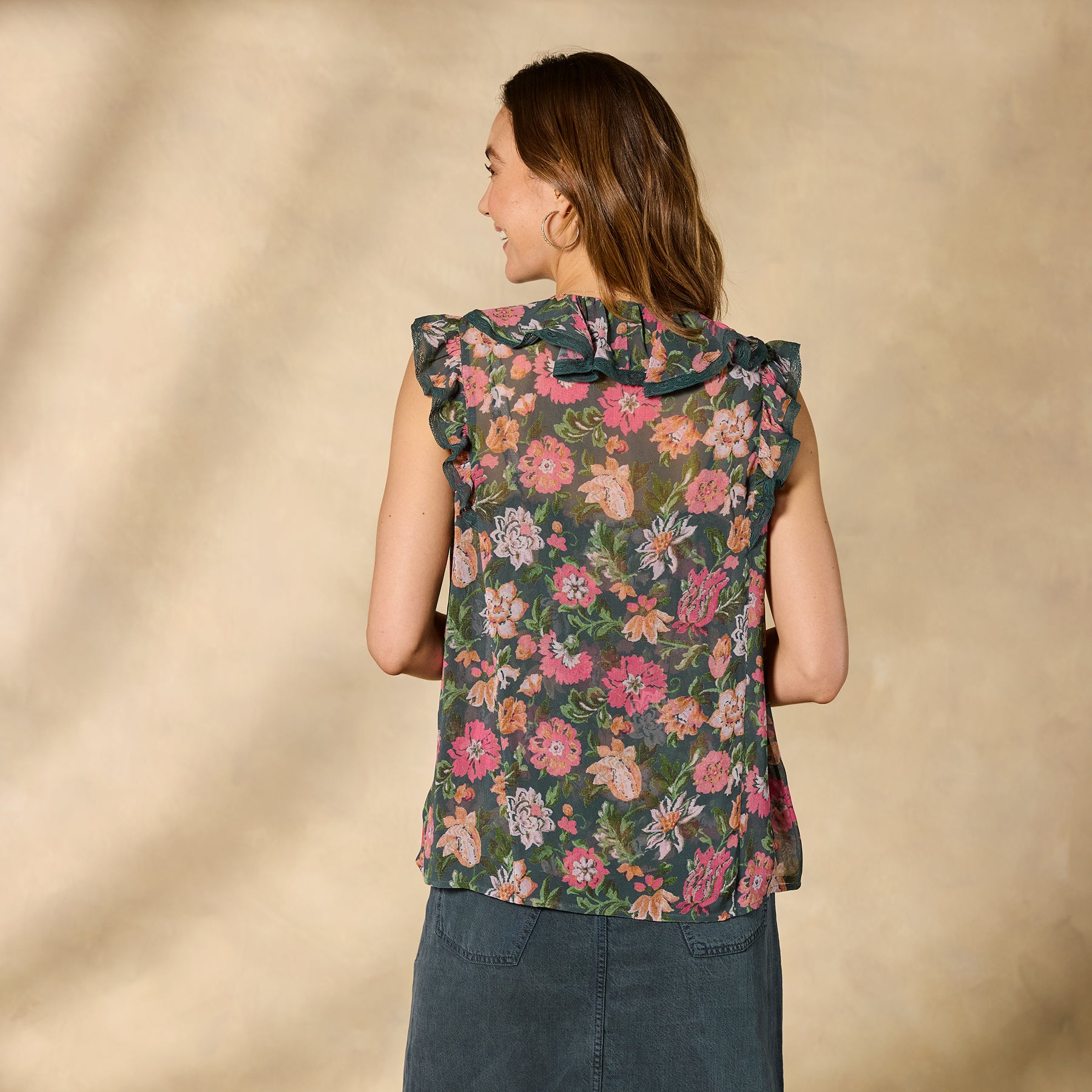 Elegant flutter sleeves. lace accents and a flirty flounce around the neckline add a fluid beauty to this soft floral top. Matching camisole included. Viscose. Machine Wash Imported. Exclusive. Sizes XS (0–2). S (4–6). M (8–10). L (12–14). XL (16–18). XXL (20–22). Approx. 25l.