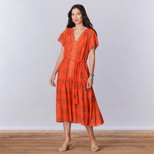 An ode to summer. our easy. flowing. floral print dress with geometric embroidery detail at neckline and placket. With one tier. flutter sleeves. notch neckline. side seam pockets and a removable ring loop rope belt. Lined. Cotton/viscose. Machine wash. Imported. Exclusive. Sizes XXS (00). XS (0??). S (4??). M (8??0). L (12??4). XL (16??8). Approx. 45l.